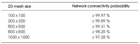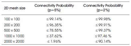 Table 4. 2D mesh connectivity probability for various network sizes and p = 2%