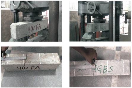 Beam specimens of size 500x100x100 mm were used for measuring flexural strength in beam moulds and compacted with modified proctor's rammer. They were demoulded and kept for curing after one day. Then Flexural strength test was conducted on the UTM of capacity 1000 KN by third point loading at 3,7,28 and 90 days [26] . Figure 5 shows the Flexure test on FRCC and GRCC. The test results are shown in Table 6.
