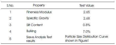 2.1.2 Fine AggregateRiver Sand was used as fine aggregate in all concrete mixes used in the experimental work. This aggregate was air dried and then cleaned to remove organic matter from it. The properties of fine aggregate is shown in Table 2. It was conforming to IS: 383-1970[16] requirements. Particle Size Distribution Curve for Fine Aggregate is shown in Figure 1.