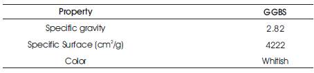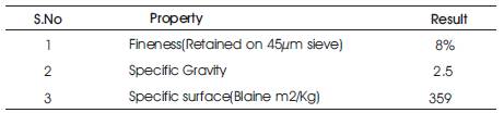 2.1.5 Ground Granulated Blast furnace Slag (GGBS)The GGBS used in this research project was collected from a Private Limited Company located at Visakhapatnam District, Andhra Pradesh, India. The GGBS was ground in a laboratory mill to a Blaine fineness of 4222 cm2/g. The Physical properties of GGBS is shown in Table 4.