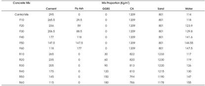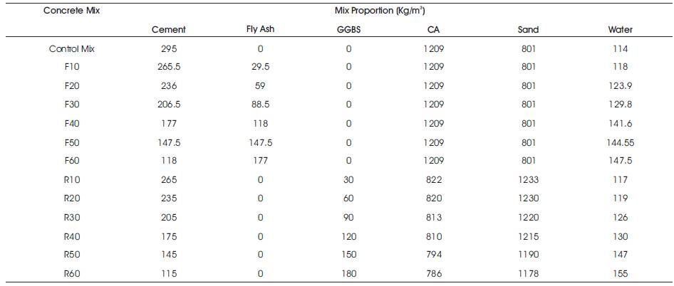 Mix proportioning of RCCP was done using ACI 211 3R-02- 2004 [18] method. This method was developed for Roller compacted concrete pavements of Rigid pavement category and it is limited to mix design with the nominal maximum size of aggregate of 19mm as per ACI 325.10R- 99[2]. The RCCP mix was proportioned for specified target flexural strengths of 5.0N/mm2 [19- 25]. The cement content 3 of control mix of RCC was 295kg/m3 . In six RCCP mixtures 10, 20, 30, 40, 50 and 60% weight of cement were replaced with mineral admixtures (GGBS and Fly Ash). The identification of mix proportions and quantity of material are shown in Table 6.