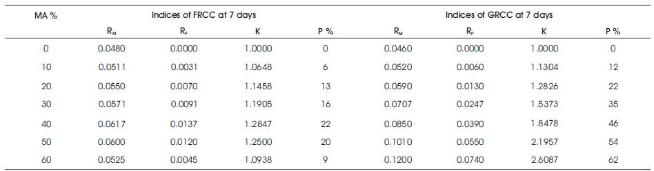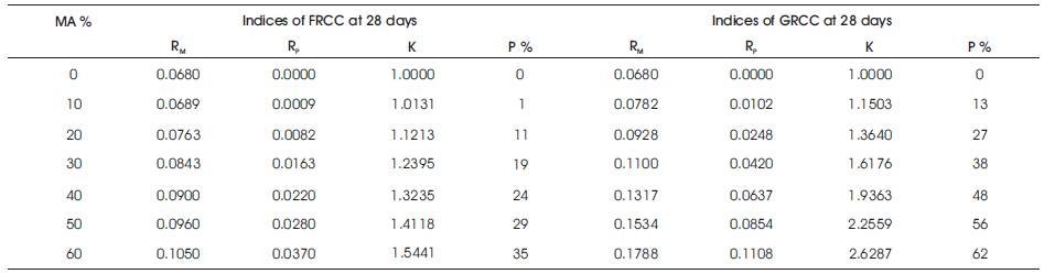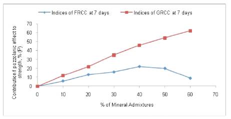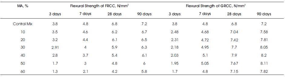 From Tables 8-11 and also from Figures 5, 10, 11, 12, 13, it is clear that the flexural strength of FRCC and GRCC and indices of pozzolanic effect is increased with curing age. During the early period of curing at 3 days, the pozzolanic effect of fly ash is minimum. As the curing age increases, the contribution rate of pozzolanic effect of fly ash also increases. This implies that curing age is an important factor in the pozzolanic effect of Fly ash for RCC.