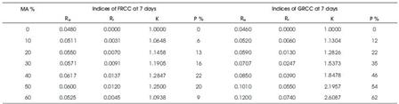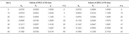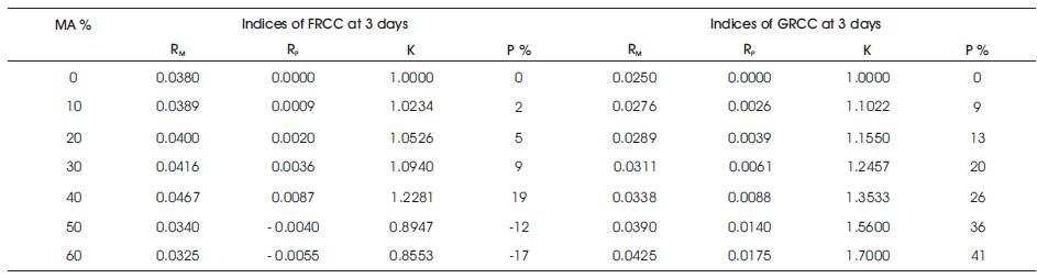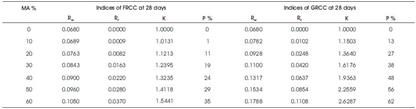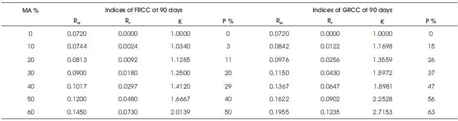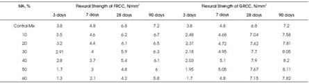 The pozzolanic indices for flexural strength for FRCC and GRCC were calculated and shown in Tables 8-10. Table 7 shows that the indices of pozzolanic effect (RP and P) of flexural strength at 3 days of curing age are showing negative values, when fly ash content is more than 50%. But in Table 10, these indices are showing improved values with an increase in fly ash content at 28 days and 90 days of curing. However, in GRCC these indices are showing positive and increased values at all ages with increased levels of GGBS.