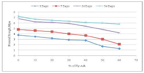 1. With the increase in Fly ash content in FRCC the flexural strength decreases. Although the strength is very low at early curing aging of 3 days and 7 days, it develops rapidly with increase in curing aging. The strength at longer ages will be exceeding with that of the control concrete mix without fly ash.