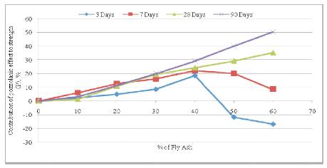 Figure 10. Change in Flexural Strength versus percent of fly ash in the Mix