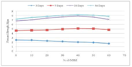 3.With the increase in GGBS content in GRCC, the flexural strength decreases at the ages of 3days and 7days, but at the age of 28days, the strength is more than control mix even at 60% replacement level.
