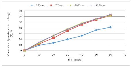 From Figures 10, 11, 12, 13 and from Tables 8, 9, 10, 11 it is seen that at all ages of curing, P has a tendency to increase with increase in GGBS content in GRCC. At early ages of curing i.e. 3days, P has a significant value of 41%. However, at the ages of 7days, 28days and 90days, the contribution of the pozzolanic effect in GRCC is remarkable and significant. A comparative variation of ‘P’ is shown in Figures 14, 15, 16, 17.