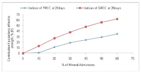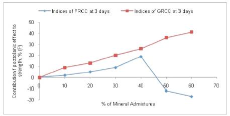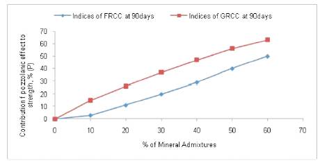 In the present paper the pozzolanic effect of two different mineral admixtures( Fly ash and Ground granulated Blast Furnace slag) in Roller compacted concrete (RCC) was studied quantitatively with various strength indices namely specific strength ratio(R), index of specific strength(K) and contribution rate of pozzolanic effect to strength(P). Cement was partially replaced with mineral admixtures by 10%, 20%, 30%, 40%, 50% and 60% by weight respectively for Fly ash (FA) and Ground granulated Blast Furnace slag (GGBS). Besides the strength properties, these indices showed that early curing age, specific strength of Fly ash Roller Compacted Concrete (FRCC) decreases with increase in FA content, whereas the specific strength of GGBS Roller Compacted Concrete (GRCC) increases with increase in GGBS content. After 90 days of Curing, the contribution of mineral admixture effect on Flexural Strength of FRCC and GRCC are 50% and 63 % respectively.