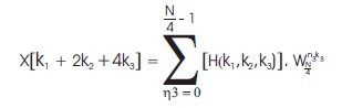 N-point FFT is obtained by iterating the procedure in Equation (8) and (9) over log2 (N-1) times. This reduces the number of operations and hardware implementation cost (multipliers and adders).