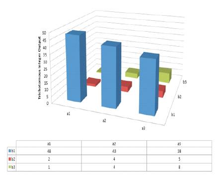 Figure 6 Summary: The sixth Figure displays the dramatic difference in the initial aggregated qualitative graphically (in cubic form) for “Trichotomous Categorical Variables” = [“TCV”] in terms of outputted “Trichotomous Outcome Variables” = [“TOV”] in hierarchal cuboids (or “rectangular prisms”) in the respective colors blue, red, and green according to their relative position on the “Standard Tri–Squared 3 × 3 Table” in variables a1 through a3 and b1 3through b3 respectively). The cuboids differ in height 3 according to their amounts as indicated on the Cartesian coordinates as listed in the “y” (or “ordinate”) axis of the graph. The abscissa or “x” axis displays the TCV data. The “z” (or “applicate”) axis creates the tri–coordinate dimensionality of the data set. This data set is further explained in the qualitative report below the graphic which serves as a key for the initial aggregated data gathered from the Tri–Squared Test “Inventive Investigative Instrument” (also called the “Tri–Squared Test: Triple–I”) data as displayed in the qualitative initial “Standard Tri–Squared 3 × 3 Table” in the Tri–Squared Calculator © (Osler, 2015).